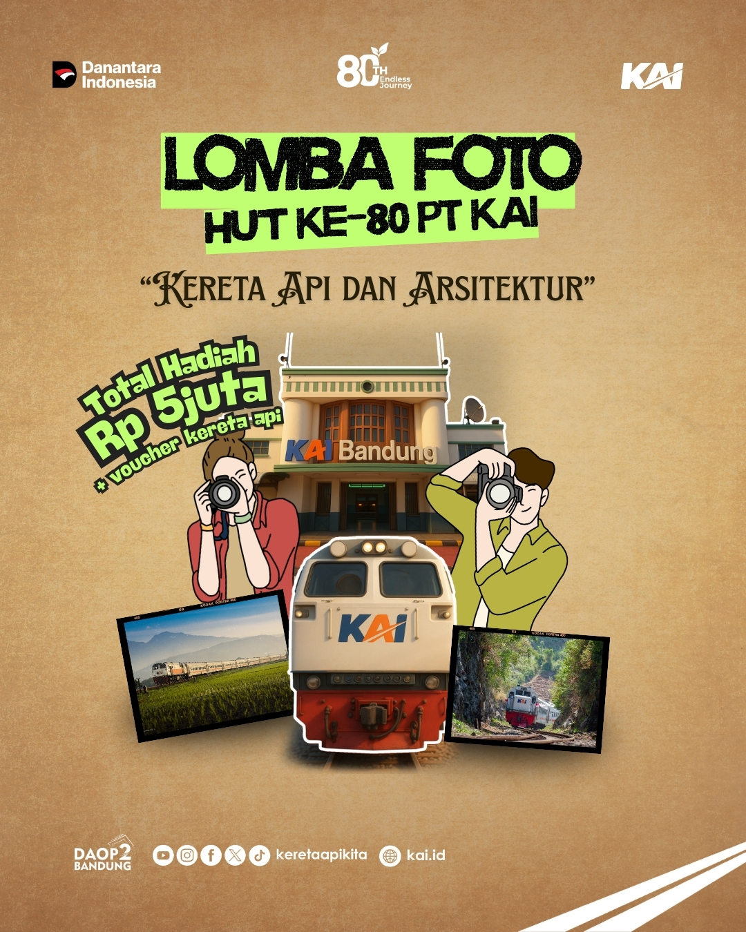 “Melalui lomba ini, kami ingin mengajak masyarakat untuk mengabadikan momen terbaik tentang kereta api dan arsitektur di wilayah Daop 2 Bandung. Selain menjadi ajang kreativitas, lomba foto juga bagian dari semarak HUT ke-80 KAI bertema Endless Journey,” ujar Kuswardojo, Manager Humasda KAI Daop 2 Bandung. Senin (15/9/2025)
