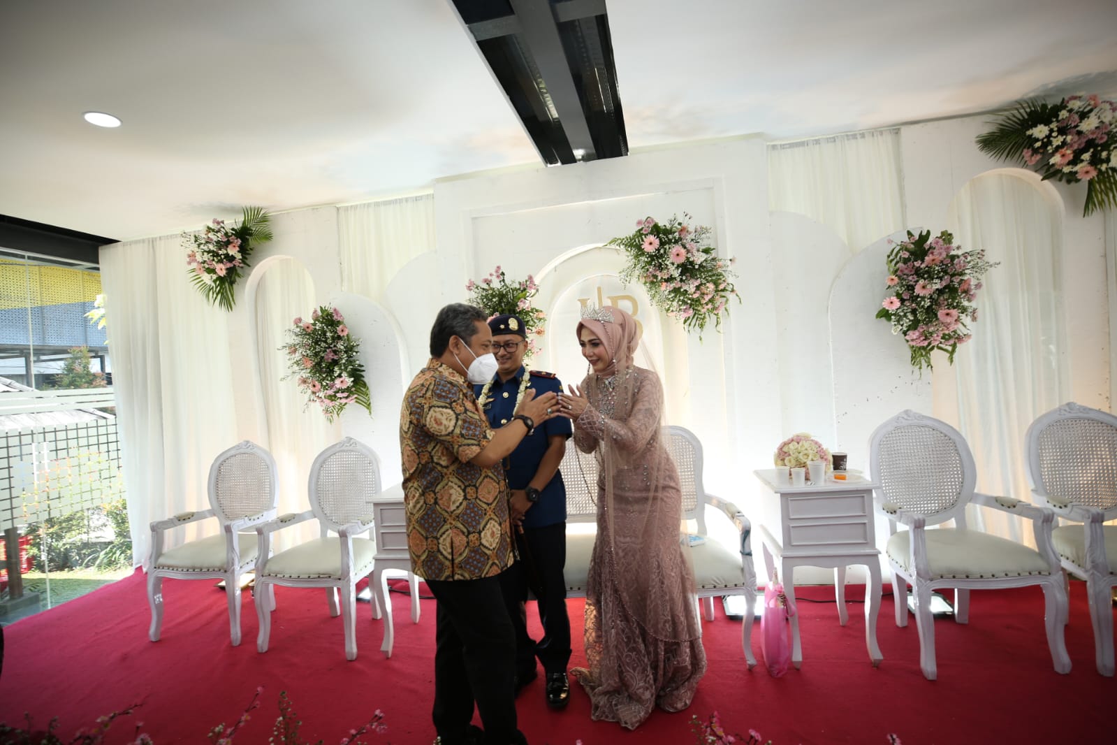 Meski terlihat sederhana, tapi momen sakral ini masih tetap berlangsung dengan khidmat. Alunan musik yang tenang dan ornamen bunga mawar pink menambah syahdu suasana pernikahan mereka.