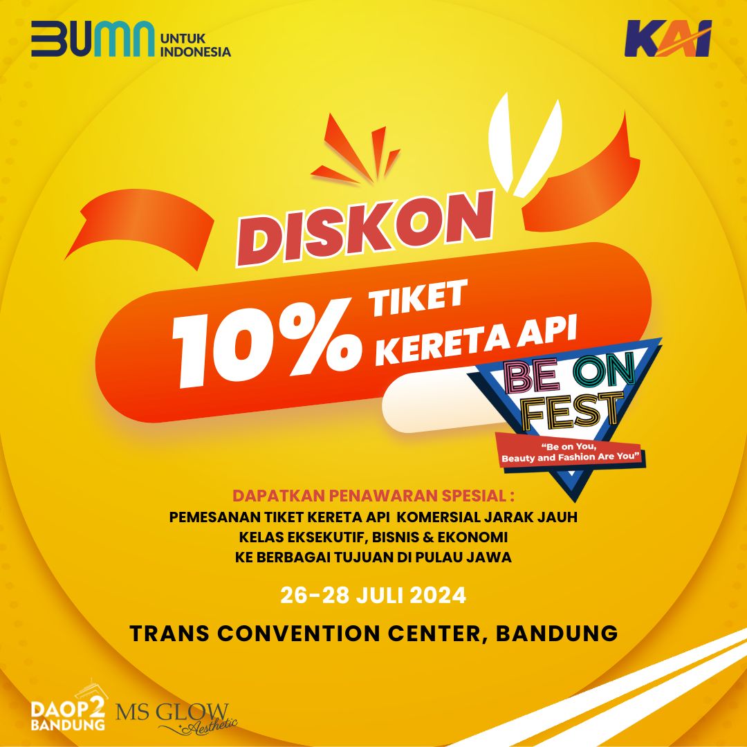 MADANIACOID – PT Kereta Api Indonesia (Persero) Daerah Operasi 2 Bandung memberikan diskon 10 persen untuk pembelian tiket KA Jarak Jauh komersial. Pemberian diskon ini dilakukan KAI dalam penyelenggaraan Event ‘BE ON FEST, Be on You Beauty and Fashion Are You’.