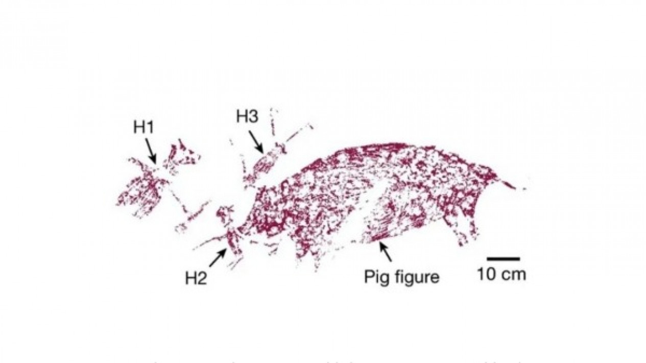 Lukisan tersebut menggambarkan tiga sosok manusia yang berinteraksi dengan babi liar, menunjukkan komunikasi naratif di zaman prasejarah. Gambar itu dilukis dengan pigmen merah tua yang berasal dari tanah liat. Babi liar itu diperlihatkan dengan tonjolan seperti tanduk di wajahnya, yang merupakan ciri khas spesies jantan.