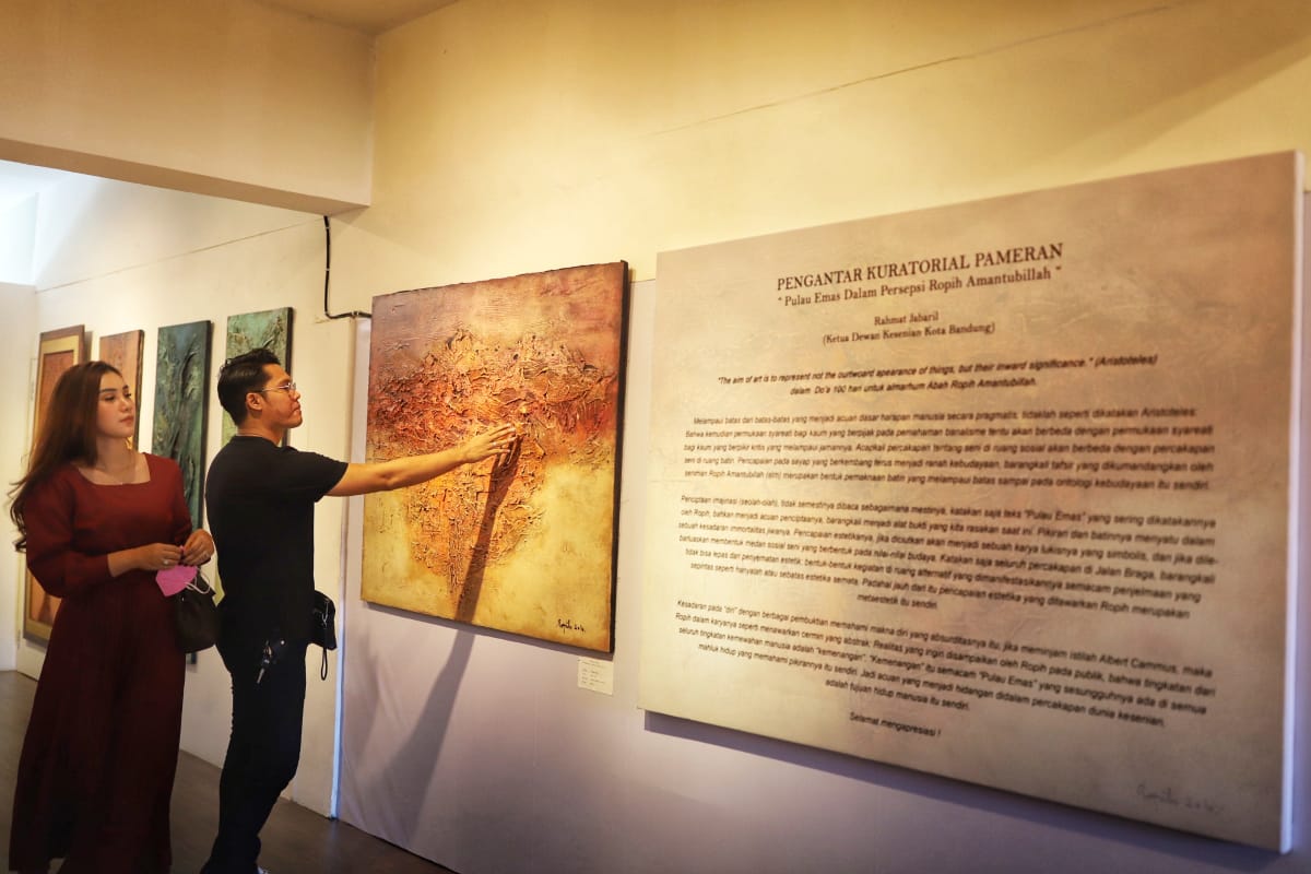 Filosofi dari seniman Lukis, Ropih Amantubillah itulah yang diangkat dalam Pameran Lukisan “Pulau Emas” Mengenang 22 tahun Ropih Berkarya yang digelar di Galeri Seni Ropih Jalan Braga Kota Bandung sejak Minggu 7 Agustus sampai 28 Agustus 2022 mendatang.