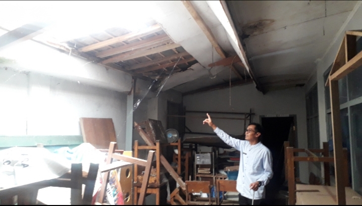 “Kondisi bangunan sebagian sudah di topang bambu, begitupun dengan bangunan kelas sebagian sudah rusak bahkan ada yang ambruk” ujarnya.