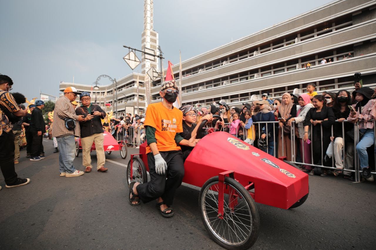 MADANIACOID – Ada sebuah kendaraan ikonik diantara arak-arakan Festival Asia Afrika tahun 2024. Kendaraan itu berupa sebuah kereta tanpa mesin yakni sebuah kereta peti sabun.