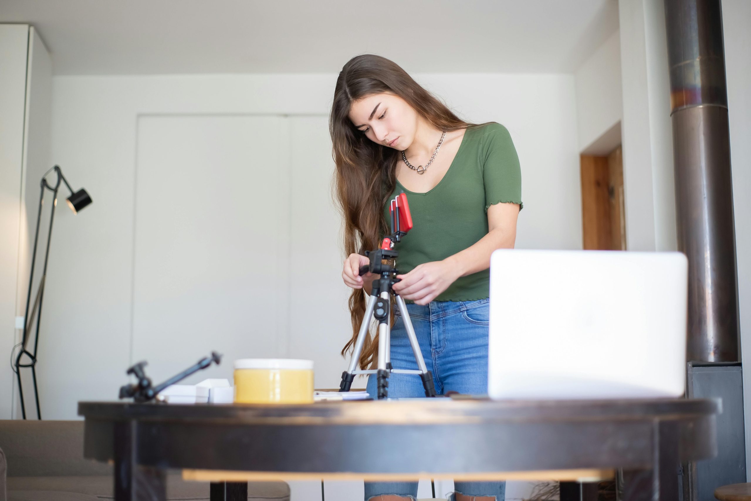 Seorang perempuan menyiapkan tripod dan ponsel di depan laptop, menggambarkan aktivitas membuat konten dari rumah.